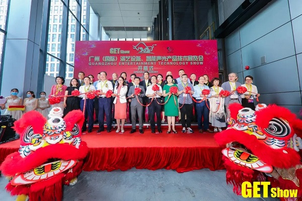 本次开幕式现场得到了众多领导嘉宾的支持,他们分别是中国文化和文旅部科教司原司长孙若风先生、广东省文化和旅游厅副厅长赵红女士、广东省贸促会秘书长敖妍女士、中国演艺设备技术协会朱新村理事长、中国舞台美术学会曹林会长、中国录音师协会名誉理事长高雨春、广州市工商联余剑春副主席、中共广州市委外事工作委员办公室市管一级调研员涂宏哲、广州市商务局会展中心谢黄怡副主任、广东省演出行业协会刘莹会长、广东省舞台美术研究会梁溪清会长、广东省声像灯光科技促进会彭妙颜会长以及来自全国著名音响师、灯光师、舞美设计师,各行业商会协会专家老师们、展商朋友们、媒体朋友们。伴随着热烈的掌声,一众嘉宾共同为2021年GETshow开幕式剪彩,正式开启为期四天的展会。